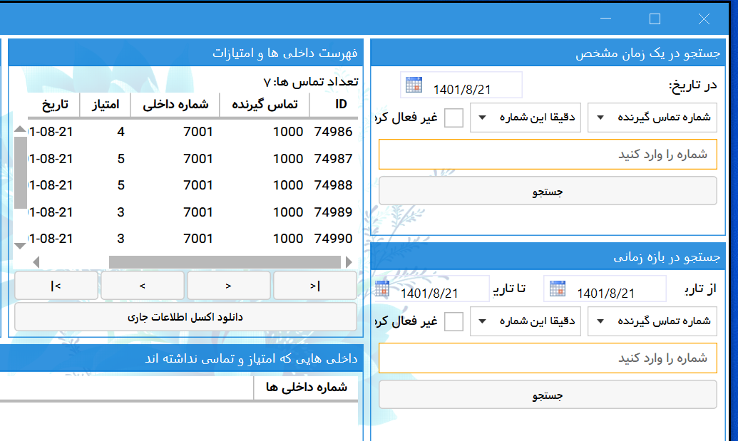 • مشاهده جمع امتیاز هر صف در بازه های زمانی به همراه تعداد تماس ها